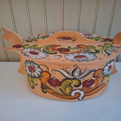 Selger denne flotte veggbollen ,rosemalt tre i bondefarger .