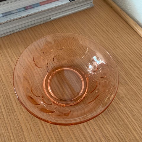 Fint fransk vintage servise i grønt glass. 5 asjetter i klart glass og en glassbolle (ukjent merke) med glatt innside og lett ruglete utenpå. 21 cm i diameter på bollen og 19 på asjetter. Selges samlet for 650 eller 298 for asjetter og 400 for bollen.