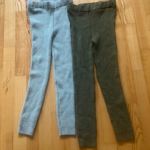 En kjøpt og en hjemmestrikket ribbebukse med strikk i livet