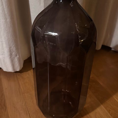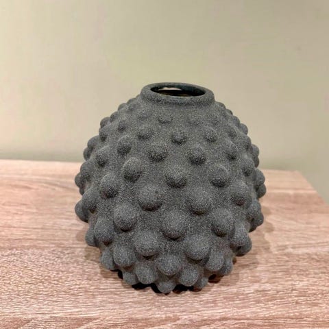 Sort med tagger. Er glassert inni så tåler friske blomster.