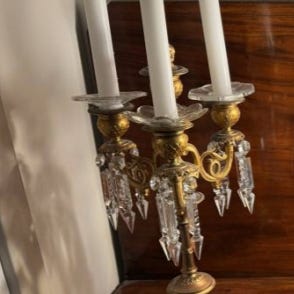 Selger 2 retro/kitch lysestaker fra 70-tallet med krystall prismer. Like hele, ingen prismer mangler. Den høyeste lysestaken har fot i marmor. Selges samlet for kr 700. Må hentes, våger ikke å sende.