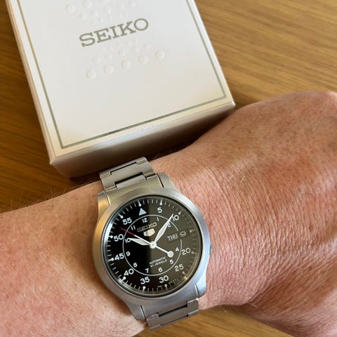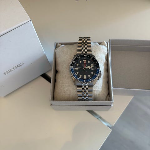 Seiko 5 Sports SRPG29 som ble kjøpt for rundt 2 år siden. Har et par naturlige ‘’hairlines’’ og et lite merke på glasset men synes ikke så veldig godt.