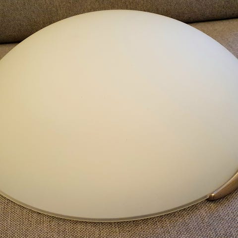 Bruker to E14-sokkel pærer. 30 cm i diameter og bygger ca 13 cm ned fra taket.