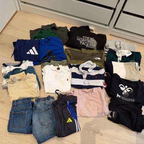 Eneste merknad er at blå Adidas buksen er slitt på knær, ellers er resten pent brukt 😊