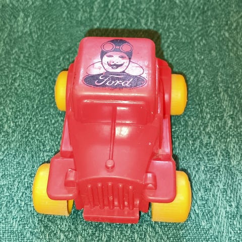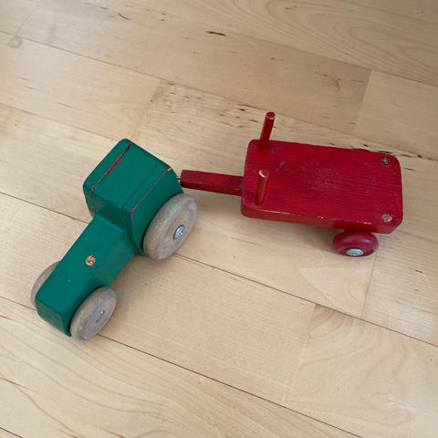 En morsom traktor laget i tre av britiske Escor Toys. Litt uvisst hvor gammel denne er, de produserte samme modell på 50-tallet, men denne kan også være 70-80-talls. Jeg har lagt ved skjermdump av noen andre annonser. Mangler personen som kjører traktoren, ellers i fin stand. Artig samlerobjekt, eller leke.