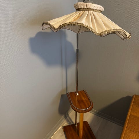 Pen retro bordlampe med trefot og flettet lampeskjerm. Lampa fungerer fint.