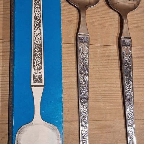 Retro salatbestikk i rustfritt stål og teak skaft. Lengde ca. 30 cm.. Det ligger i orginal esken.
