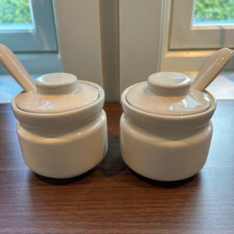 Nye ubrukte honningkrukker i fargene rød og gul selges.