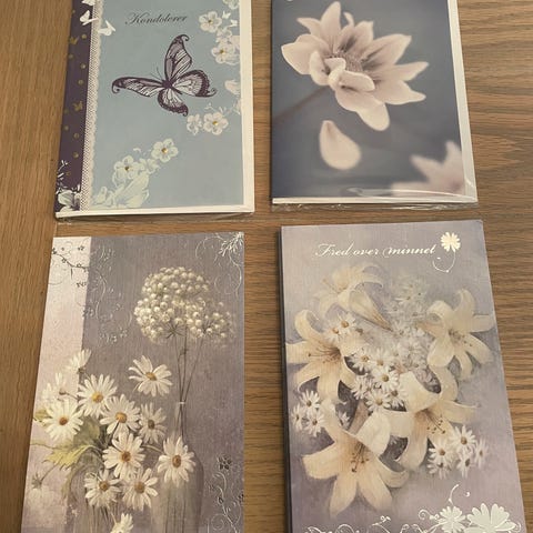 Selger 5 pakker takkekort i forbindelse med dødsfall. 8 kort med konvolutter i hver pakke.