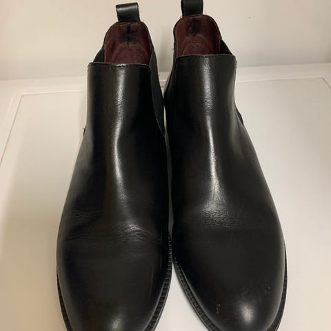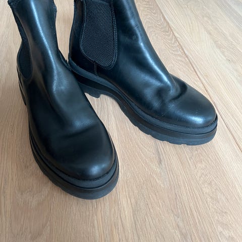 Ukjent merke støvler i størrelse 41. Støvlene er svarte med en tykk, lys brun såle. Materialet ser ut til å være skinn eller imitert skinn med elastiske sider for enkel på- og avkledning.