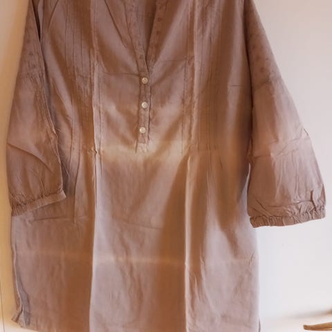 Lang, selskapsbluse fra Micha. Splitt nederst. Korte ermer. Perlemorsdekorasjoner i front. Størrelse 44.