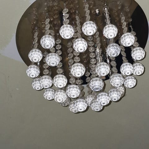 Moderne taklampe som selges da den ble litt for stor i min lille stue. Kjøpt på Lampemagasinet. Pærene er anbefalt til lampen av Lampemagasinet og følger med. Ny pris per pære var 249 kr stykk. Pærene gir et varmt og koselig lys (se bilde 3). Jeg har også satt på Ikea smart lysepærer som kan følge med. Så totalt 12 pærer.