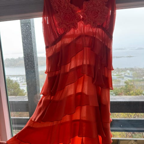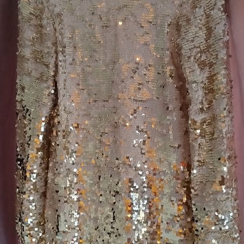 Lekker sort oneshoulder kjole med paljetter ved bryst. Kan passe opptil ein M. Underdel i florlett chiffon, kort framme og lenger bak. Selges kr 200