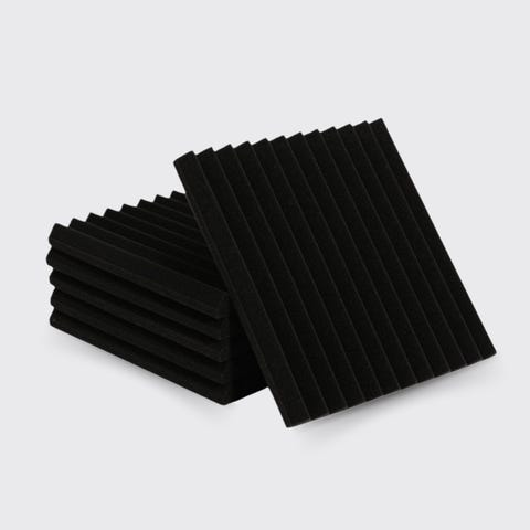 Kvadratiske sorte akustiske skumplater i pakker på 6. 100 kr per pakke.