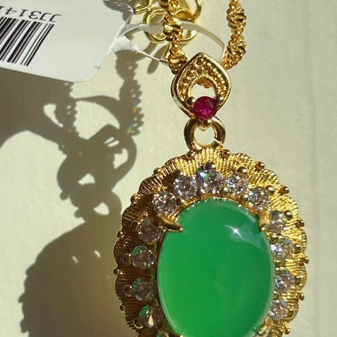 2) Lengde kjede 46 .5cm, lengde anheng 30x30mm, anheng av ekte jade og zirkon ,(For både kvinner og menn) pris kr:389