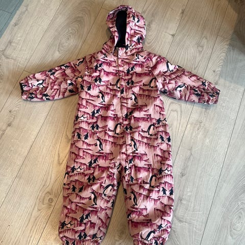 Color Kids parkdress for jente i størrelse 86. Dressen er rosa med pingvinmønster og har hette. Den har glidelås foran og strikk nederst på bena med fotstropper for å holde bena på plass. Innsiden er fôret for økt komfort og varme. Egner seg til bruk i barnehage og utelek i kjøligere vær.