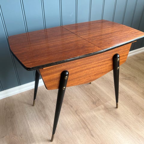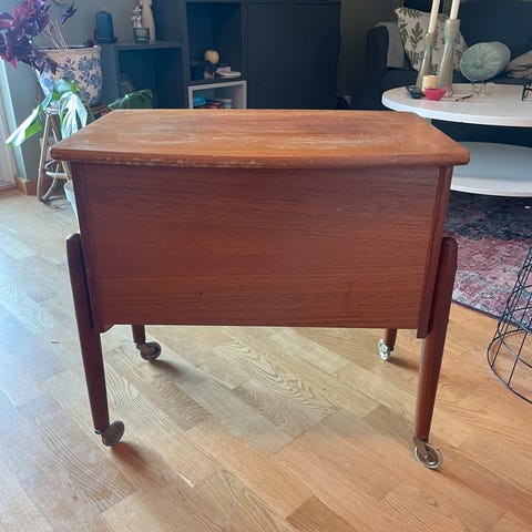 Sybordet er et stort rom innvendig. Bordplatene går fint inntil, og fra hverandre. Størrelse 64cm × 38,5cm. Høyde 50cm. Beina er nok beiser for mange år siden, før jeg ble eier. Det vises på underside, se bilde.