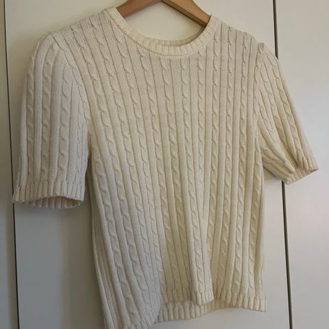 Lite brukt(som ny) t skjorte i bomull. Lys blå med kabelmønster. Kjøpt for liten. Ikke røyk eller husdyr.