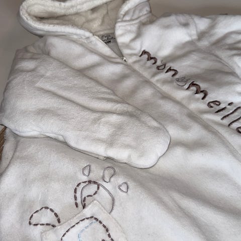 Selger denne vognpose/vogndress i størrelse 74/80 som kan blir brukt i forskjellig funksjoner. Enten med ben, eller som pose, eller bare jakke. Votter er også avtakbar.