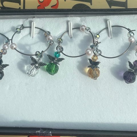Wine glass charms til stetten på vinglass for å holde styr på hvem som eier drikken :)