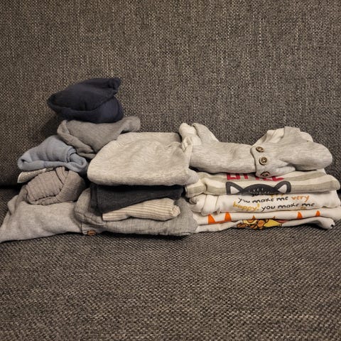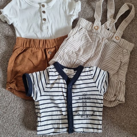 🧸Selger en pakke med 6 heldrakter i størrelse nyfødt (0–3 måneder).. Klærne er fra merker som Zara, Petit Bateau og Lindex.
