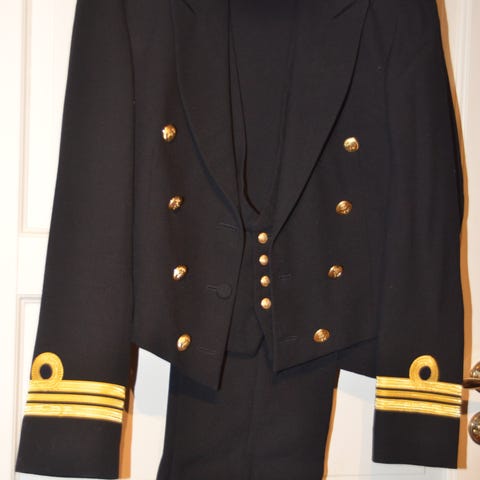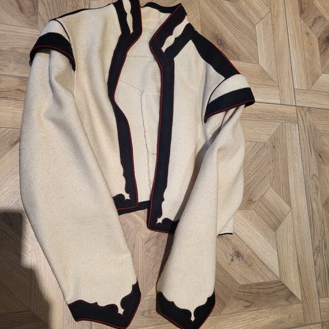 Herrebunad frå Vest Telemark. Passar høgde på ca 170-175 cm ( liten m ) Jakke, vest, bukse + knappar. Sylvknappar frå Gunnar Helle, Setesdalen. Jakke: Lengde rygg: 57 cm, bredde nedre rygg: 50 cm, lengde øvre rygg 40 cm, arm frå skulder: ca 60 cm, innerlengde arm ca 43. Bukse: livvidde ca 95 cm( noko legg til å utvide) Innerlengde bukse ca 74 cm, ytterlengde ca 103 cm ( kan leggast ned ca 3 cm)