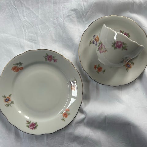 Koppene er like, underskålene har ulik dekor men passer helt perfekt til hverandre og koppen.