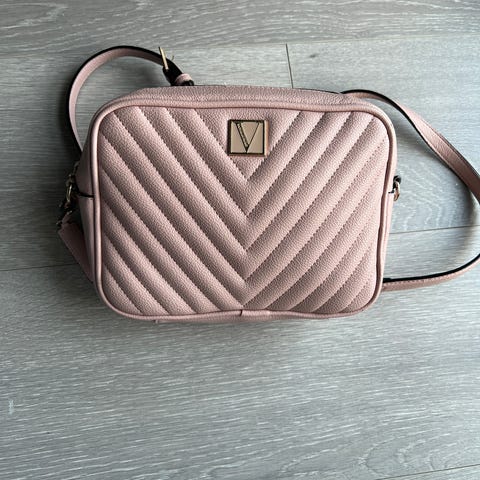 Rosa veske kjøpt i syden og fått som gave. Er ikke ekte merkevare. Har 3 glidelåslommer, og skulderen. Så god som ny.