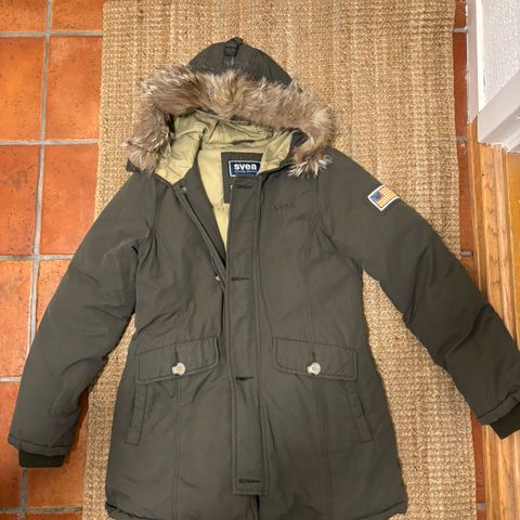 Jakken er kjøpt for noen år siden men brukt kun et par sesonger før den ble litt liten. Hengt i skapet etter det. Tykk og god en kald vinterdag med deilig hette med pels hvor pelsen er avtagbar. Veldig pent brukt så ingen synlig slitasje. Fargen er grønn, litt som militær grønn.