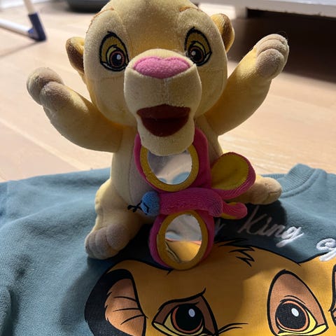 Fin utgave av Simba fra musikalen «Lion King». Armer, bein og hode kan beveges. Bamsen er lite brukt og fremstår nesten som ny, men lappen (tøylappen) har blitt fjernet. Ca. 35 cm..