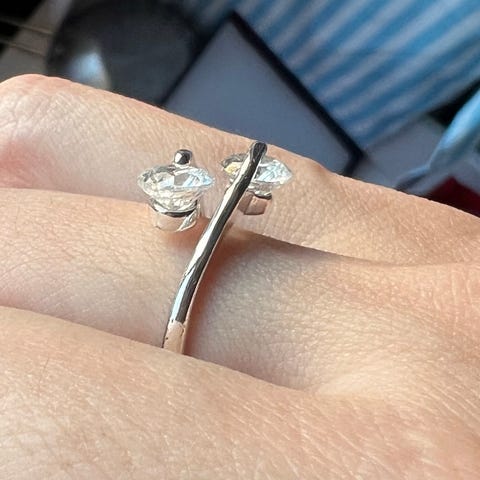 Diameter ring 18 mm. Kan reguleres. Testpennen viser at den er ekte Moissanite.
