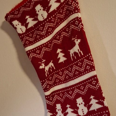 Kul håndstrikket julestrømpe. Røde og sorte ruter. Strikket av Snow ullgarn og fått en fuskepels kant oppe strikket med effektgarn.