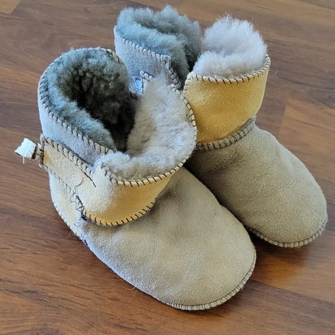 Babytøfler i saueskinn fra Shepherd of Sweden. Str 22/23. Brukt en del, men mye bruk igjen. Har gått litt opp i sømmen på sida men det kan jeg reparere før de selges. Ny pris var 600 kr. Selges nå for 180 kr.