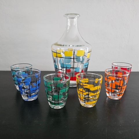 Karaffel og 5 glass med geometrisk mønster i forskjellige farger