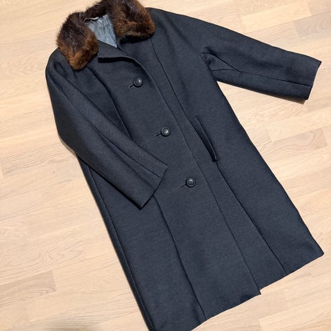 Strøken, skjelden ullkåpe med pelskrage i nydelig blåfarge. Kåpen er av ypperste kvalitet foret ogmed svært forseggjorte detaljer.