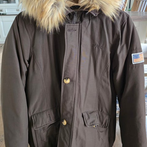 Mørk blå varm jakke. Fint brukt, ingen bruksmerker på utsiden, noe merker etter vask med leppestift i lommen på innsiden av jakken.
