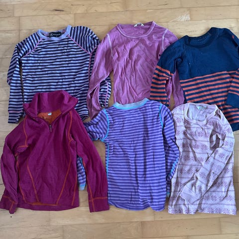 Alle plaggene er Janus, 4 ulloverdeler og 2 ull longser. Alt er helt og like pent, med unntak av den rosa ulltrøye som har en liten flekk på kragen. Mulig den kan gå bort i vask, se nærbilde.