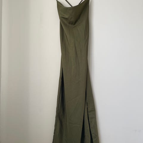 Laget i shiny rayon, ser ut som silke men er mer slitesterkt. Fargen fremstår mer som dyp champagne enn beige. Det står rens på denne, men jeg har håndvasket den, og det gikk helt fint.