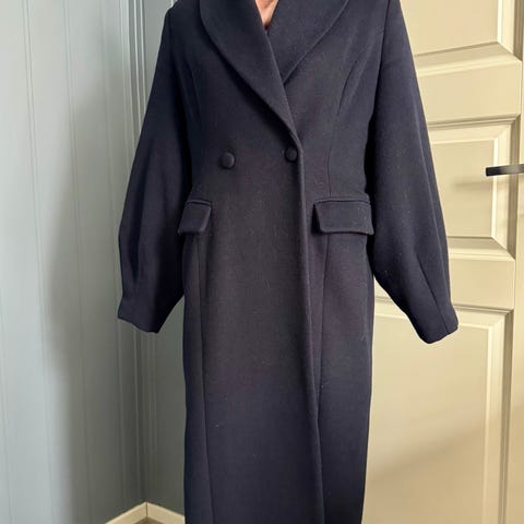 Moderne og elegant vinterkåpe i ull og polyester blanding. Nett slank fasong. Fargen er dyp blå/midnattsblå.