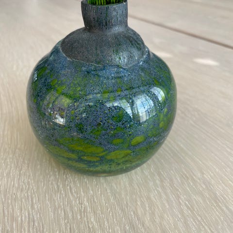 Svært pen liten vase egentlig oljelampe fra Töpferhof i tidligere Ødt-Tyskland. Vasen måler 7,5 cm i høyden og er bredere enn den er høy. Denne er muligens fra 60/70 tallet. Besøk meg gjerne i vikingskipet den 20 og 21 september stand B 55-56