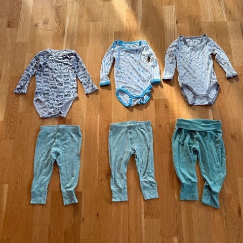 En body har et lite hull i øverste lag på det ene ermet. Lett å fikse. Kanskje to små svake flekker på en annen body. En body har en del nupper, og noe nupper på buksa. Mye bruk igjen.