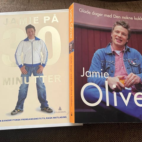 To praktfulle kokebøker av Jamie Oliver. 50kr per stk