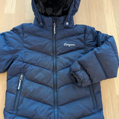 Bergans Down Youth Jacket. God og varm på kalde vinterdager. Med avtakbar hette, 3 lommer og halvhanske inni ermene. Meget pent brukt, fremstår som ny. Pris som ny kr 2200.
