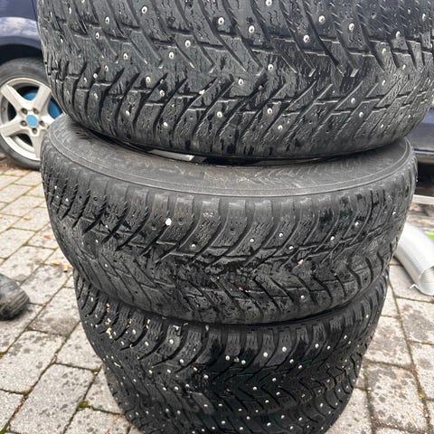 Komplette hjul bestående av dekk montert på felger. Brukt tilpasset kjøretøy, egnet for vinter- eller helårsbruk avhengig av dekkmønster og slitasje. Hjulene er av stål og har synlig mønsterdybde.