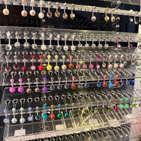 Fire flotte navlepiercinger, alle uten kule. Hvilket metall det er vet jeg dessverre ikke, men det er ikke nikkel. Dette vet jeg fordi jeg selv har nikkelallergi. Så disse er mest sannsynlig laget i kirurgisk stål.