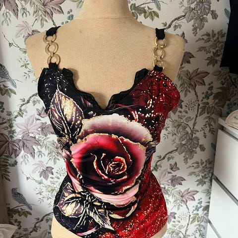 Festfin ‘Madonna’ topp med påsydde perler/gullblomster.