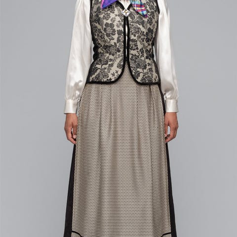 Lue, jakke og skjørt samt fotsid vest i rødt. Tilhørende rød lue.