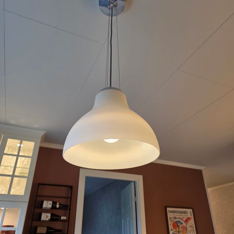 Lampa er i metall. Hvit. 20 cm lang og 14 cm i diameter..Hullene på toppen sprer lys opp samtidig som det er lyskjeglen gir godt med lys ned.