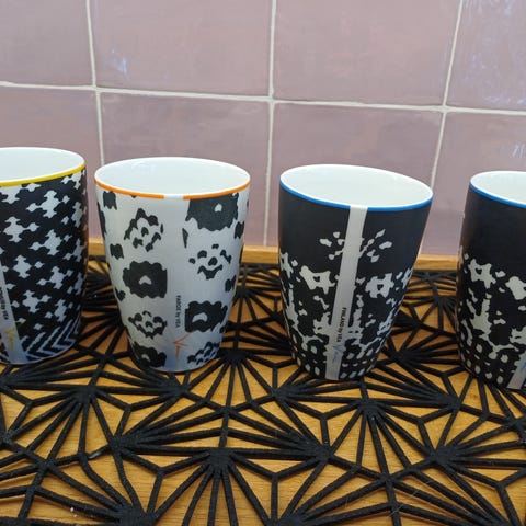 To flotte Limited Edition strikkekopper uten hank, designet av Pernille Vea for Menu.Høyde ca 10,5cm og diameter ca 7,5cm. Pent brukt. Pris er samlet.