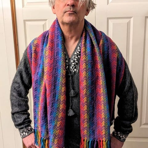 Skjerf i alpakka fra Peru. Helt nydelig i lilla med alle 7 farger i regnbuen. Tradisjonelt skjerf. Varmt og godt. Hentes i Tønsberg eller postes.